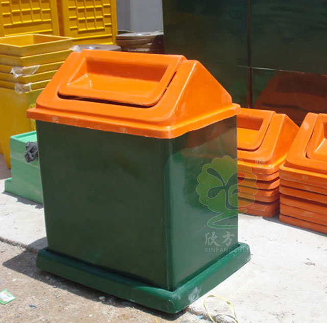戶外搖蓋式屋型玻璃鋼垃圾桶型號規格:A03;720*500*980mm,采用優質玻璃纖維與進口樹脂著色合成,采用模具一次成型。玻璃鋼造型精美、潔凈、美觀、醒目、不退色,它具有強度高、耐腐蝕、耐酸堿、抗老化、太陽暴曬下不變形、抗紫外線、操作方便等特點是其他材質無法取代的。產品顏色及絲印可按客戶要求定制,無毒無污染,長久使用不褪色油漆不脫落。玻璃鋼垃圾收集箱適用于小區、市政、工廠、學校、物業等戶外垃圾桶的配置。