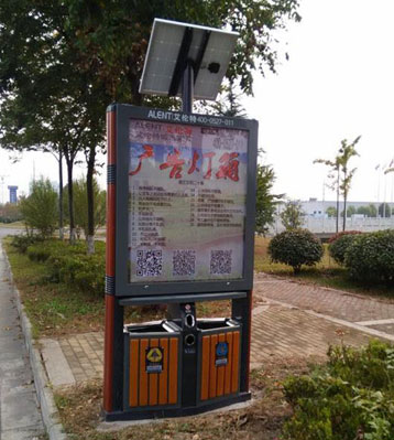 太陽能廣告垃圾桶的型號規(guī)格:GG9,900*400*2000mm,隨著城市美化與亮化的推進,垃圾箱將會在城市的發(fā)展中擔當重要角色,作為一與百姓生活密切相關的載體,在垃圾桶上刊登廣告將能夠有效吸引消費者的眼球,產(chǎn)生非常好的廣告效果,對于樹立公司良好形象以及提高公司知名度,并提高廣告招商力度具有深遠的意義。廣告垃圾桶燈箱具有、投入成本低,直接受眾效果好。 相比較其他形式的廣告而言垃圾桶廣告的成本相當?shù)投沂侵苯用嫦驈V告受眾,貼進消費者,形成高覆蓋網(wǎng)絡規(guī)模廣告效應。比起電視和報紙廣告來說有著無法擬比的優(yōu)勢。